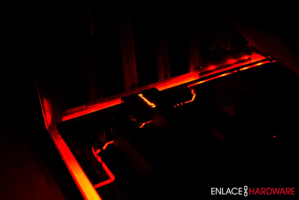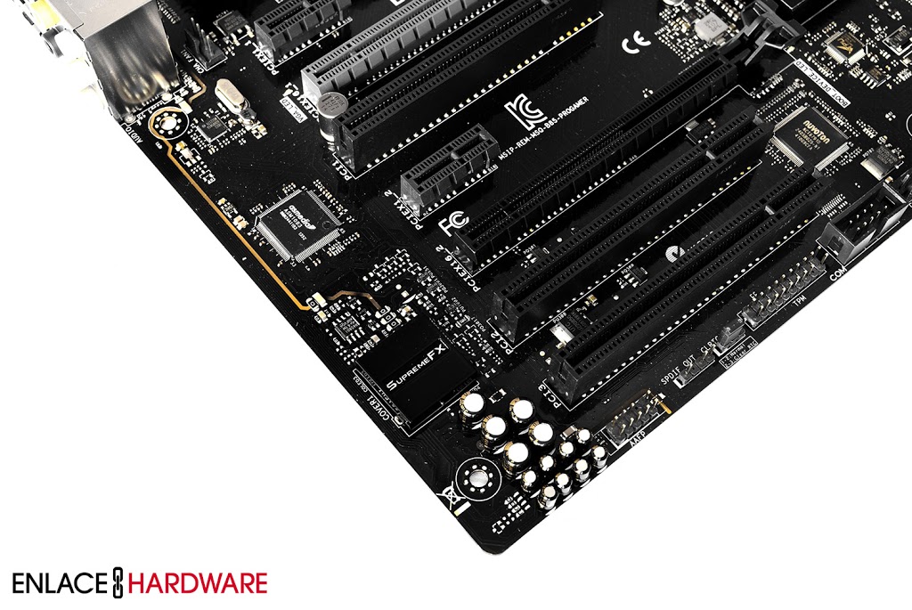 Una vez que encendemos nuestra PC podemos observar como la línea que separa los componentes de audio se ilumina de color rojo, en el protector del chip de audio vemos la leyenda SupremeFX también iluminada de color rojo, dándole un toque bastante atractivo y que seguro gustara a todos los que cuentan con un gabinete con ventana de acrílico y gustan de estos detalles estéticos.