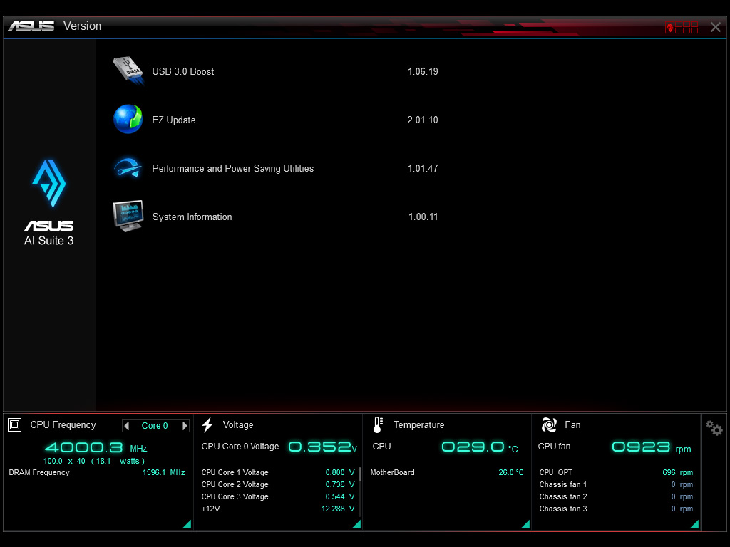 Adicional a las herramientas anteriores, nos encontramos con estas otras que pueden llegar a ser muy útiles. Como por ejemplo, USB 3.0 Boost que nos permitirá acelerar la velocidad de transferencia en los puertos USB 3.0, o bien EZ Update, que nos permite actualizar el BIOS con tan solo un par de clics. Por último, tenemos System Information, que nos brinda información muy útil del sistema y la opción para visualizar la versión de Al Suite Instalada y la de las herramientas que lo conforman.