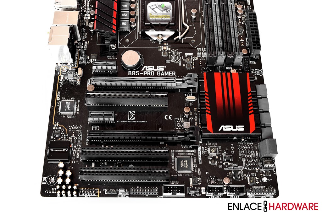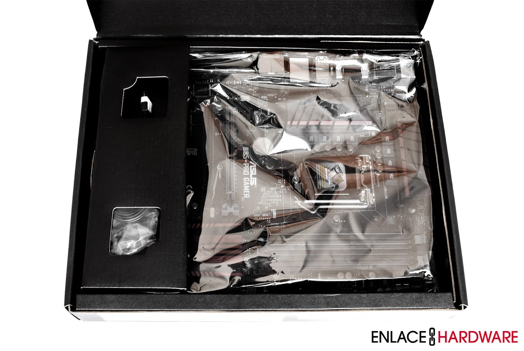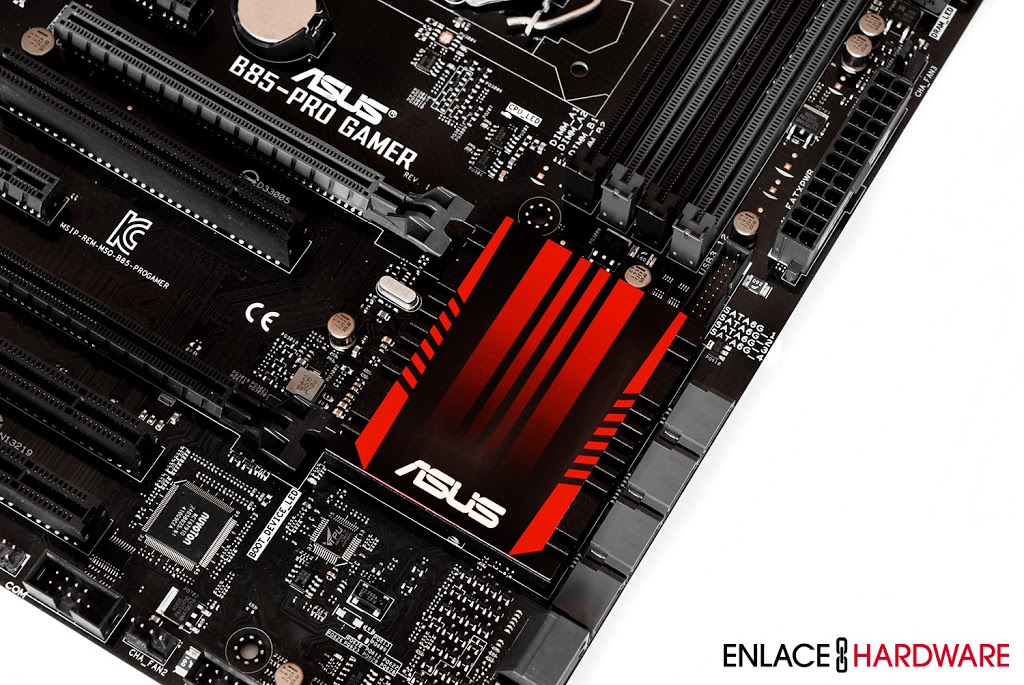 Fuera de la bolsa anti estática, nos encontramos con la B85-Pro Gamer en todo su esplendor, luciendo una excelente combinación con un PCB en color negro con tonos en rojo en sus disipadores pasivos, muy al estilo de la línea ROG.