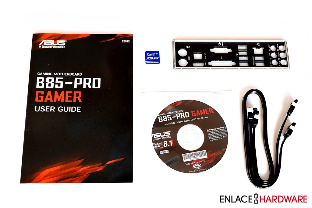 A primera vista apreciamos un diseño en tonos rojos, blanco y negro, colores que hasta el lanzamiento de esta línea ASUS había usado exclusivamente en su línea ROG, encontramos información de primera mano cómo el logotipo de ASUS, el tipo de tarjeta madre (que en este caso es para Gaming), modelo e iconos de tecnologías soportadas por la tarjeta madre, entre las que destacan el uso del Chipset B85, soporte para procesadores Intel zócalo 1150, soporte para configuraciones Crossfire de AMD, resolución 4K para los gráficos integrados y por ultimo compatibilidad con Windows 8.1.