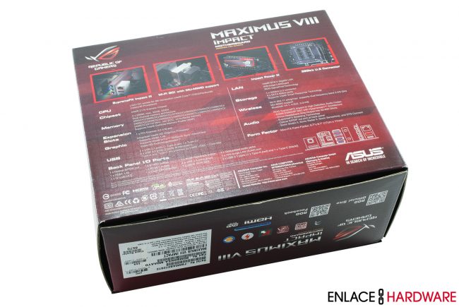 La ASUS Maximus VIII Impact viene en una pequeña caja rectangular. Debido a su tamaño, solamente se exhibe el logotipo, el modelo y algunas características de la tarjeta madre en la cara frontal. También está presente una calcomanía grande que nos recuerda de la cuenta Premium de regalo para el juego de World of Warships durante un periodo de 15 días. La cara trasera de la caja se utiliza para enumerar 4 características más importantes de la tarjeta madre. También contamos con una tabla de sus especificaciones técnicas y un desglose de los puertos posteriores del panel I/O.