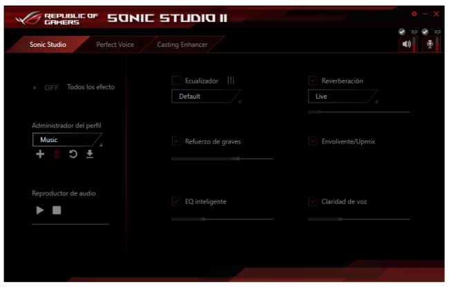 Sonic Studio II es una nueva adición al arsenal de software de ajuste de audio. En resumen, el software tiene 3 funciones principales. La función de sonido envolvente virtual permite disfrutar de 7.1 canales de sonido empleando unos auriculares estéreo. Ofrece efectos de Reverberación, Mejora de graves, Ecualizador, Voz clara y EQ inteligente. En segundo lugar, la función Perfect Voice reduce el ruido de las comunicaciones durante las partidas. La función Casting Enhancer ayuda a enriquecer la calidad de sonido del streaming y la grabación reduciendo el ruido y estabilizando el nivel general de las voces además de proporcionar una mejora en la reproducción de los detalles y mejora la respuesta en frecuencias graves de tus juegos y canciones.