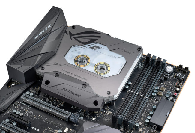 Para crear esta nueva solución de enfriamiento de agua, ROG se asoció con Bitspower. Diseñando desde cero el monobloque de la Maximus IX Extreme, este bloque cuenta con sensores en su interior para las fugas de agua y poder medir la temperatura, todos perfectamente integrados a la tarjeta madre para mantener la integridad de el cableado y de la tubería intacta.