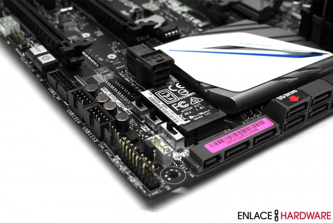 El puerto M.2 se ubica por debajo del disipador pasivo de calor del PCH. Puede utilizar hasta 4 líneas de PCIe mientras acomodando dispositivos con protocolo SATA y PCIe. Caben SSDs con longitudes desde los 42mm hasta los 110mm.