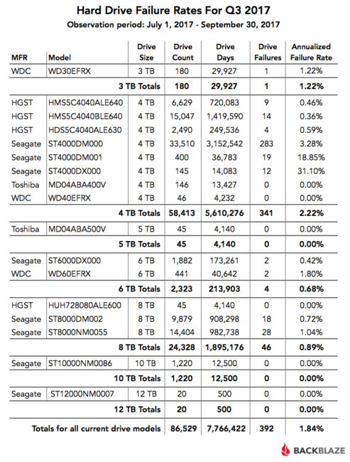 En el tercer trimestre del 2017, Backblaze introdujo discos duros de 10 TB y 12 TB en sus centros de datos, retirando discos duros de 3 TB y 4 TB para aumentar la densidad de almacenamiento, y agregar más de 59 petabytes de almacenamiento de datos para aumentar su capacidad total de almacenamiento a 400 petabytes. Durante el trimestre, Blackblaze agregó 9599 discos duros nuevos y retiró 6221 discos duros, para un agregado neto de 3378 unidades y un total de 86529. Estos números son para esos discos duros de los que tienen 45 o más unidades ya que anteriormente se necesitaban 45 unidades (actualmente 60) para llenar un módulo de almacenamiento. Blackblaze considera un módulo de almacenamiento como unidad base para la prueba.