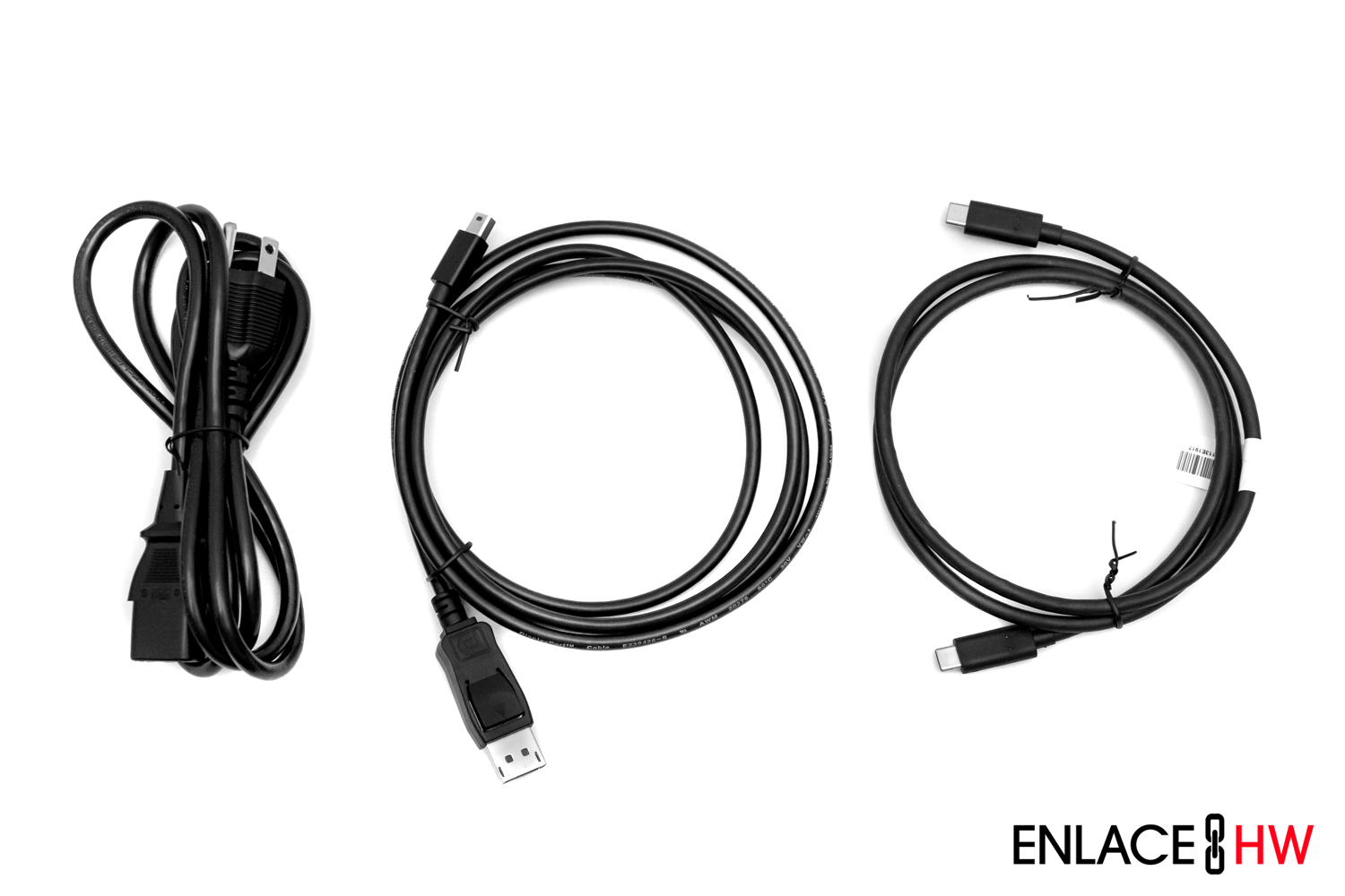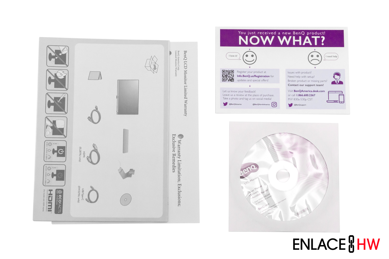 Dentro de la caja lo primero con lo que nos encontramos es con los accesorios y folletería del monitor, los cuales consisten en un manual de inicio rápido, póliza de garantía, un disco con controladores, cable de corriente, cable DisplayPort a HDMI y uno más USB Tipo C.