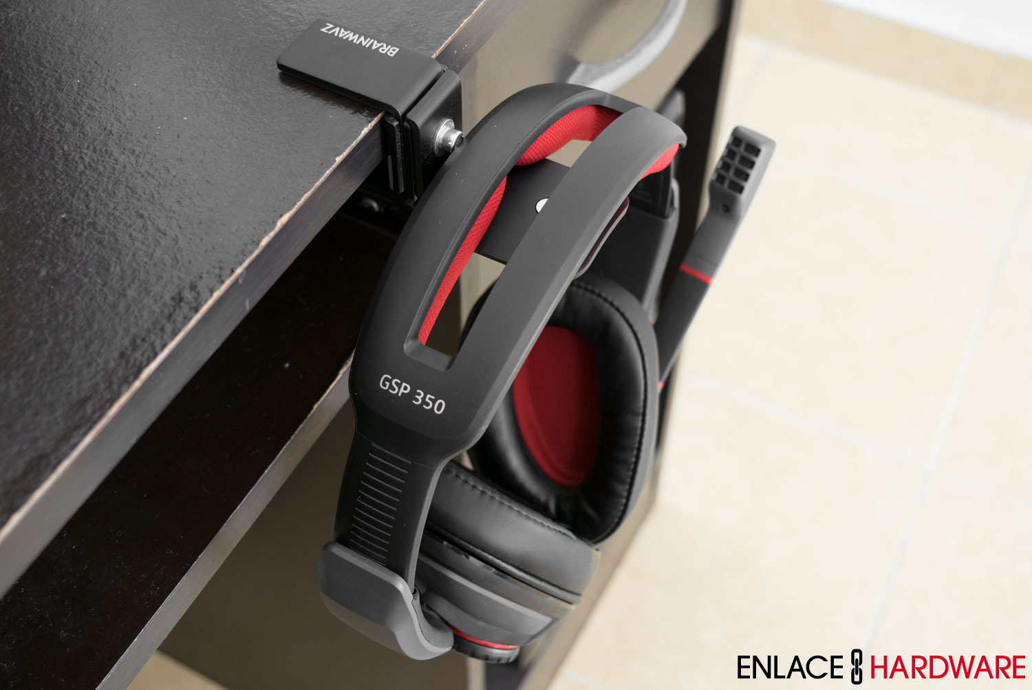 Examinando el producto de cerca, se puede apreciar un diseño realmente funcional. El Brainwavz Hengja está básicamente compuesto de cuatro piezas. La placa para colocar los auriculares esta unida a una pieza en forma de L. A su vez, esta pieza en forma de L está unida a otras dos piezas en forma de L que forman una abrazadera. Las tres piezas están unidas mediante un tornillo Allen que permite al usuario ajustar la expansión vertical o cambiar la orientación del Hengja. Como se puede observar, una de las piezas en forma de L cuenta con un disco giratorio y un tornillo para ajustar el producto al grosor del escritorio o estante.