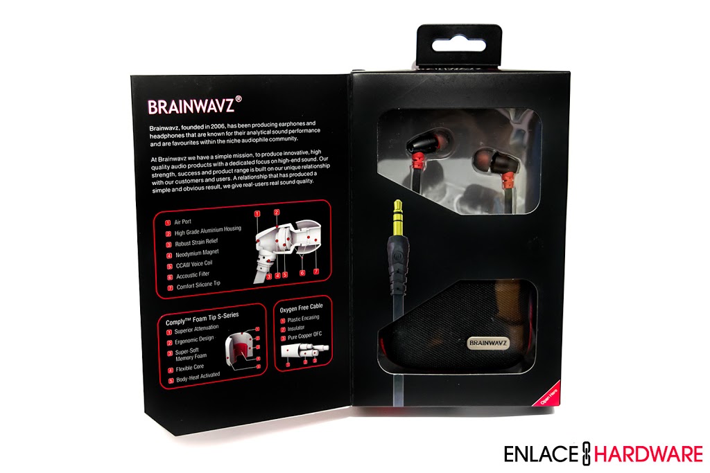 Volviendo al frente del empaque nos encontramos con una solapa, donde al momento de abrirla podemos apreciar muy a detalle lo Brainwavz S0 y el estuche que se incluye, lo cual se agradece bastante ya que nos permite apreciar muy de cerca las dimensiones, la calidad y el buen diseño del que gozan los S0.