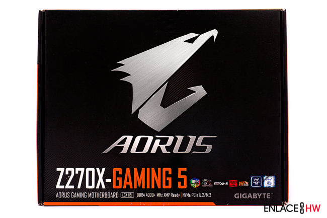 La tarjeta madre AORUS Z270X Gaming 5 se nos entrega en una caja donde el logotipo de AORUS es el protagonista en gran parte de la cara frontal de la caja, acompañado por supuesto del modelo y los logotipos de tecnologías soportadas por esta tarjeta madre, así como el número de zócalo, la compatibilidad con memorias DDR4 con perfil X.M.P. arriba de los 4000MHz, y el soporte para dispositivos de almacenamiento NVMe PCIe en formato U.2 y M.2.