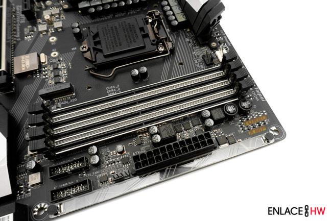 En la parte estética, nos encontramos con una tira de plástico transparente entre cada ranura de memoria RAM y una justo en el costado del conector de corriente ATX de 24 pines, estos se encuentran aquí con el fin de dar una mayor cobertura de los LED RGB situados en estos puntos.
