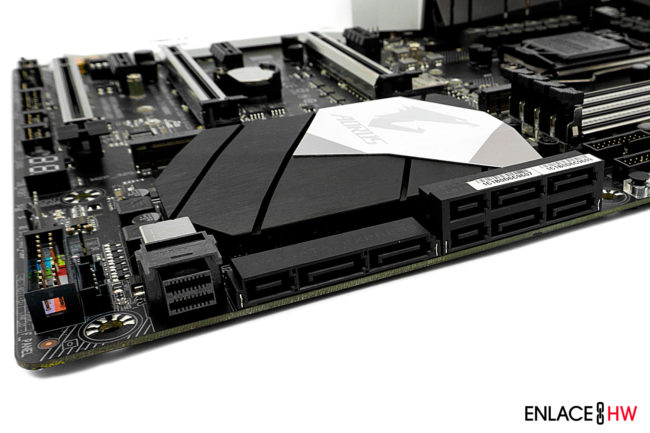 La parte del almacenamiento esta conformada por seis puertos SATA III, tres puertos SATA Express y un puerto U.2. Además podremos encontrar dos puertos para SSD M.2. El primero de ellos se encuentra justo debajo del zócalo del procesador, compatible con SSD M.2 del tipo 2242/2260/2280/22110 y el segundo se ubica entre las ranuras PCIe y es compatible con SSD M.2 de tipo 2242/2260/2280. La única diferencia entre los dos puertos es la compatibilidad con SSD M.2 de 110mm que ofrece el puerto ubicado en la parte superior. Esta tarjeta madre ofrece soporte para arreglos RAID 0, RAID 1, RAID 5 y RAID 10.