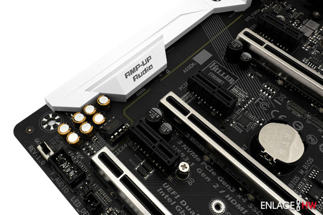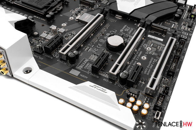 Justo debajo de los puertos PCIe encontramos el switch de ganancia de audio, el conector para el panel de audio frontal, un conector para un TPM, dos conectores USB 2.0 para el panel frontal, el Debug LED y por último, pero no menos importante, un conector de 12V para conectar una tira de LED’s RGBW de hasta 2 metros o una potencia nominal de 2A.