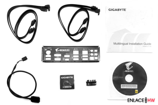 En conjunto con la AORUS Z270X Gaming 5, el usuario recibe 4 cables SATA III en color negro, un cable para conectar una tira de LED’s RGB independiente, un I/O Shield para el panel trasero, un conector G para el panel frontal del gabinete, así como un manual de usuario y el DVD de soporte.