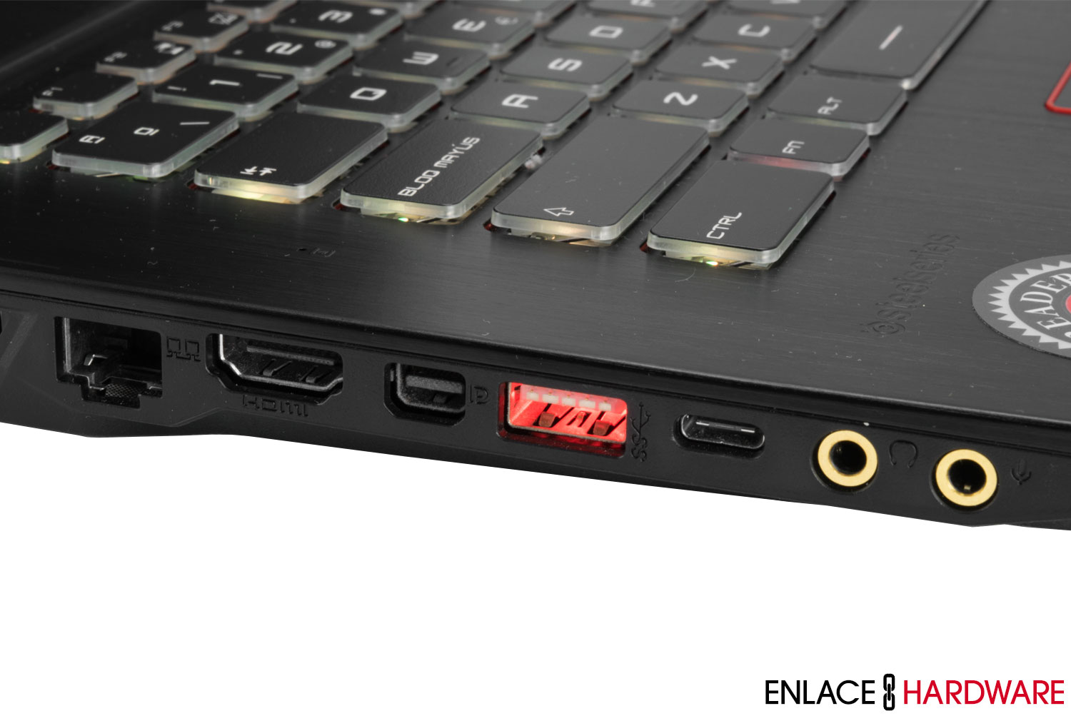 La mayoría de los puertos restantes están situados en el costado izquierdo del equipo. En esta área se sitúan una entrada para micrófono, una salida independiente para audífonos, un puerto USB 3.1 Tipo-C, un puerto USB 3.0, un puerto mini DisplayPort, un puerto HDMI y, por último, el puerto Ethernet Gigabit Killer e2500. Gracias a sus puertos HDMI y mini DisplayPort, la GE73VR 7RF Raider es capaz de soportar hasta dos monitores externos de manera simultánea.