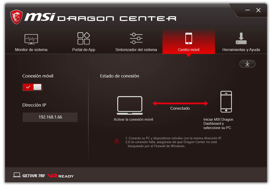 El Dragon Center cuenta además con un Centro móvil para gestionar la conexión entre tu Smartphone y el equipo, ya que MSI también ha desarrollado una versión móvil del Dragon Center.
