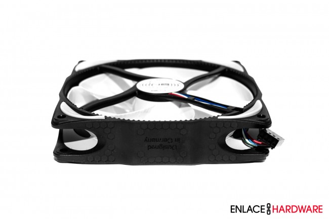 Como bien mencionamos anteriormente, no encontramos cambios físicos entre uno y otro, inclusive en su grosor. En los costados del marco encontramos un diseño a modo de textura tipo panel, en cada costado encontraremos desde el logotipo de Noiseblocker, la leyenda Diseñado en Alemania y una flecha que nos indica en que dirección fluye el aire y en que dirección rotan las aspas.