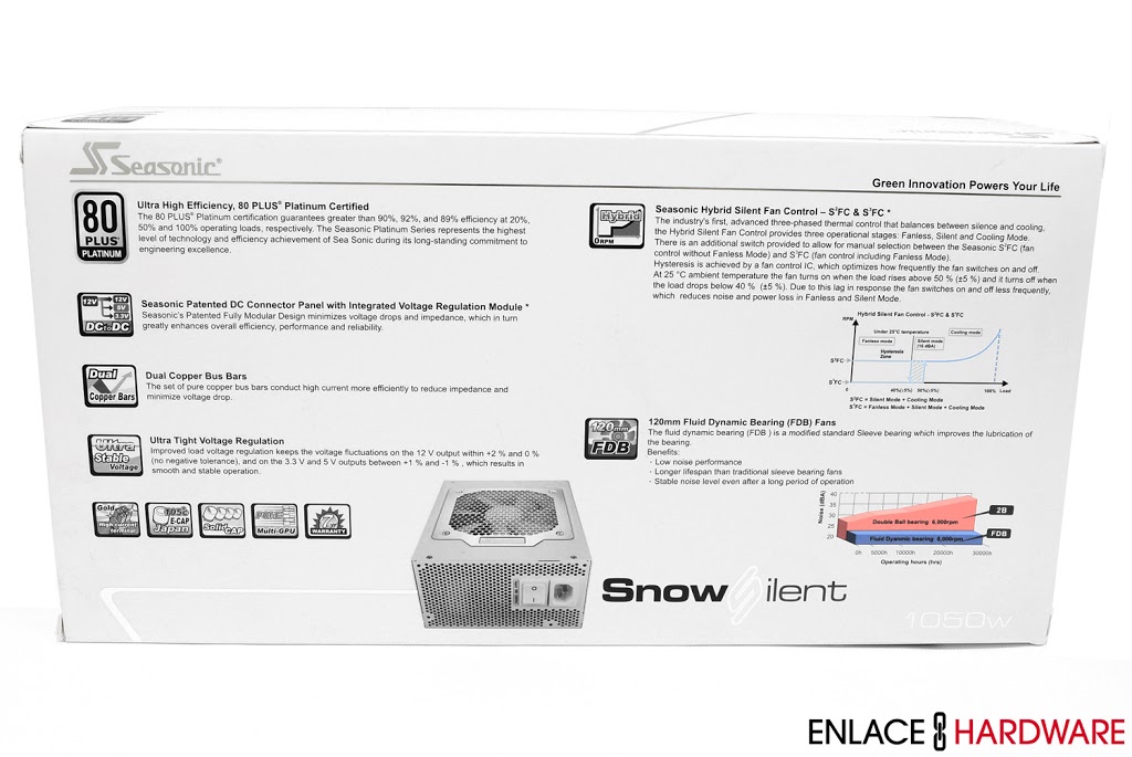 Componentes como tarjetas madres, tarjetas gráficas, módulos de memoria, disipadores de calor y los gabinetes comienzan a salir en otros colores, blanco para ser específico, la necesidad de contar con una fuente de poder de este color se materializa. Seasonic ha respondido a esta necesidad lanzando su Snow Silent 1050W que aparte de ser llamativa también es una unidad de alto rendimiento.La Snow Silent 1050W ha demostrado tener una excelente regulación de voltaje en los diferentes rieles gracias al trabajo de diseño y fabricación del equipo Seasonic y el uso de componentes de primera. La decisión de utilizar un nuevo ventilador de motor de rodamientos dinámicos por fluido también rinde frutos. La unidad exhibió una operación bastante silenciosa durante las pruebas. Técnicamente no hay ningún defecto porque no la encontraras. Y estéticamente hablando, es agradable a los ojos por su color blanco y acabado parcialmente lustroso.
