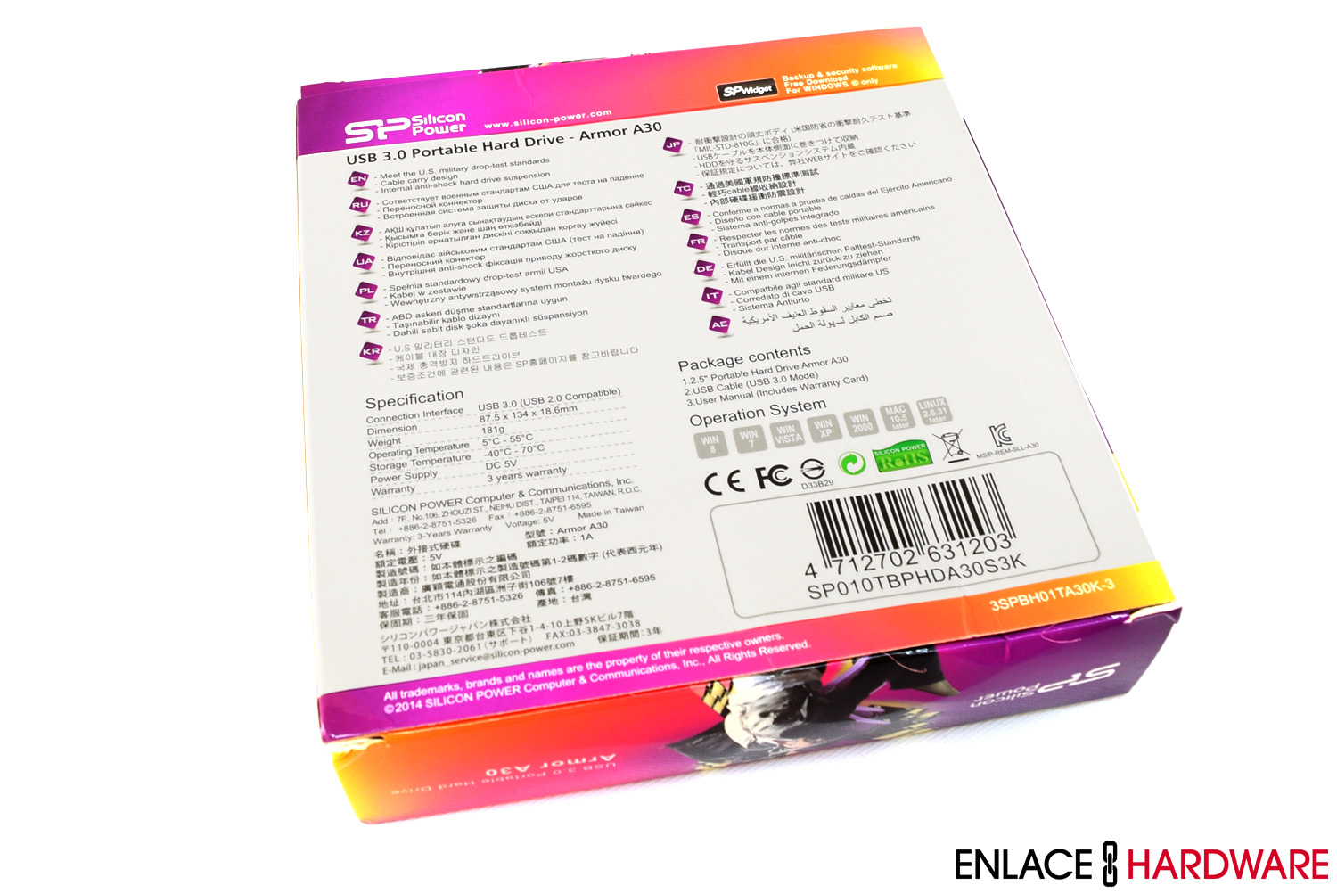 Silicon Power entrega su unidad Armor A30 1TB en una caja blanca que posee una ventana plástica lo suficientemente grande para poder examinar el producto sin tener que abrir la caja. El diseño está perfectamente elaborado y contiene todos los detalles vitales que el usuario necesita, como la capacidad, interfaz y la certificación contra caídas.