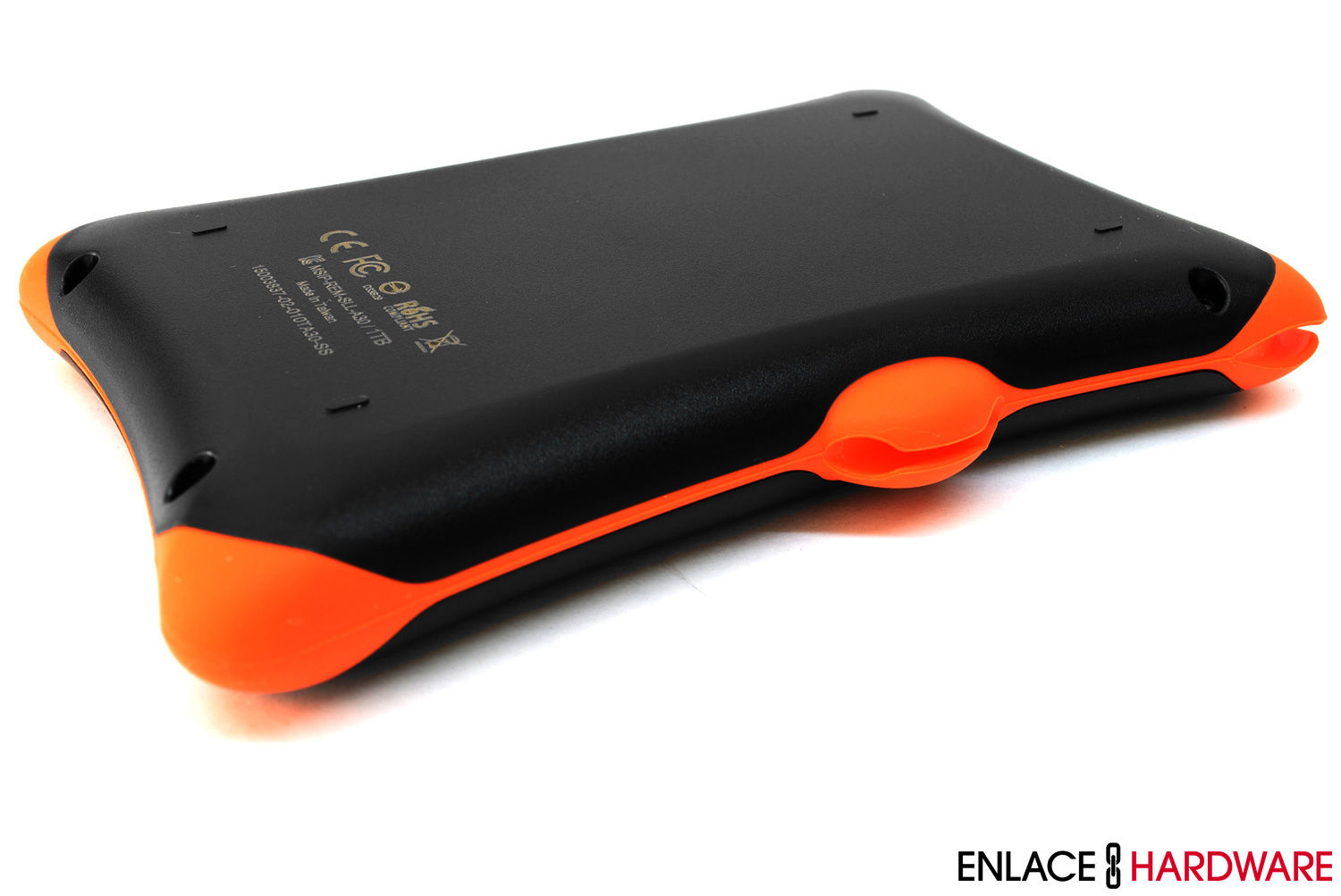 El cuerpo del Armor A30 1TB es de color negro con tonos en naranja. La parte frontal cuenta con una textura en forma de panal para resistir arañazos y rozaduras. Se instalaron parachoques de silicón en todas las esquinas y en los bordes laterales de la unidad. Muy independientemente de acentuar el producto estéticamente, los 6 parachoques forman parte del diseño exterior para disminuir el impacto de las caídas. Gracias a su diseño, la unidad ha superado exitosamente la prueba de caída MIL-STD-810G de estándar militar, lo que se traduce en una caída libre desde una altura de 300cm.