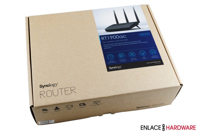 El Synology RT1900ac se entrega en un empaque ecológico donde podemos apreciar una calcomanía que exhibe una foto del producto, modelo, así como una pequeña descripción y algunas características principales. Al reverso de la caja, nos encontramos con una calcomanía grande que nos proporciona un diagrama de una red doméstica, las especificaciones del RT1900ac y por último el contenido del paquete.